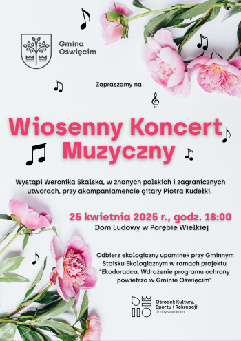 W piątek, 25 kwietnia zapraszamy Was na Wiosenny Koncert Muzyczny w Porębie Wielkiej, podczas którego wystąpi Weronika Skalska, przy akompaniamencie Piotra Kudełki.